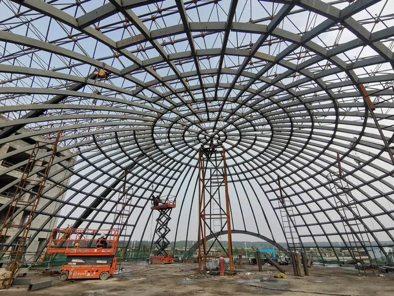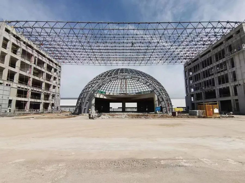 吉利飛行汽車項目汽車展廳鋼結(jié)構(gòu)工程,主體是直徑32米的橢圓形空間桁架結(jié)構(gòu),本工程加工工藝復(fù)雜,構(gòu)件數(shù)量多且雜,車間及現(xiàn)場焊接工作大,主構(gòu)件對接焊接均要求一級焊縫,施工期間兩臺全站儀同時不同角度測量,配合臨時支撐架現(xiàn)場有序、施工,整體工期45天。